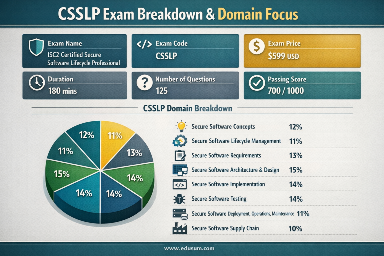 Secure Software Supply Chain - 10%: A more recent but increasingly vital domain, it addresses the security risks associated with third-party components, open-source software, and external dependencies. This includes vendor risk management, software composition analysis (SCA), and ensuring the integrity of the software supply chain.